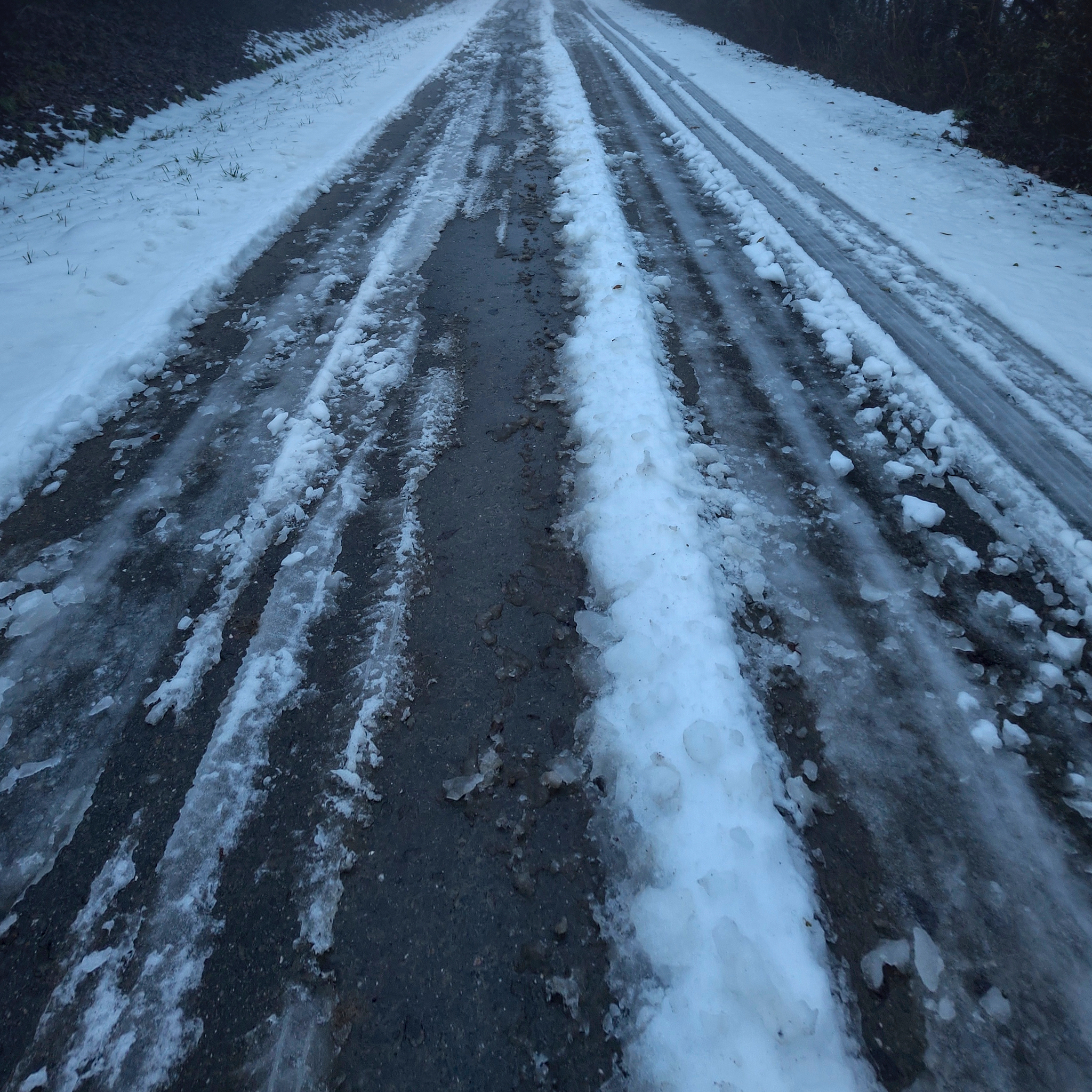 Was ich nicht dachte: Der Schnee könnte ja auch frieren, und zu Spurrillen werden, da das ein enges und schattiges Tal ist, und der Radweg direkt am Bach entlang geht … und das kann mit 37 mm-Reifen schwierig werden.