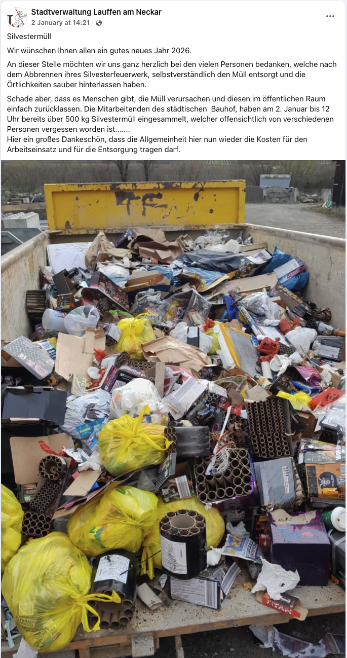 Der städtische Bauhof hatte am 2. Januar, bis zum Mittag, schon ca. 500 kg Silvestermüll eingesammelt.